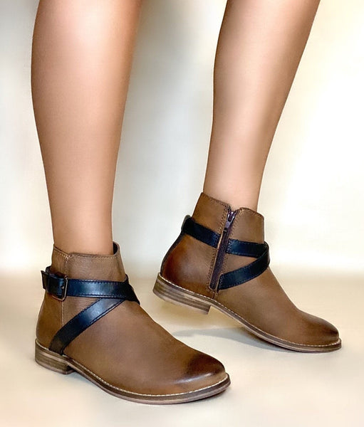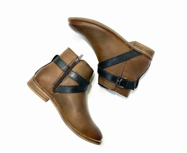 Western-inspired ankle booties in a washed leather finish, featuring decorative buckles and leather straps, side zippers, cushioned leather footbeds, and a low block heel designed to provide a stable lift without compromising comfort.