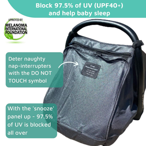 Unlike typical car seat covers, the SnoozeShade is crafted from a unique fabric that promotes a darker atmosphere, encouraging the production of melatonin—the sleepy hormone—essential for your baby’s restful sleep.
