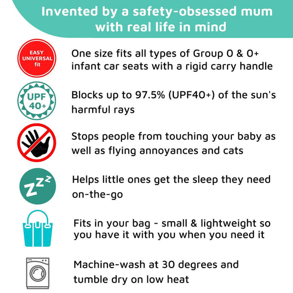 Introducing the SnoozeShade Deluxe for Infant Car Seats, the ultimate sun and sleep shade designed specifically for babies aged 0 to 9 months. This innovative product blocks up to 97.5 percent of UV rays, creating a safe and comfortable environment for your little one to nap peacefully while on the go.